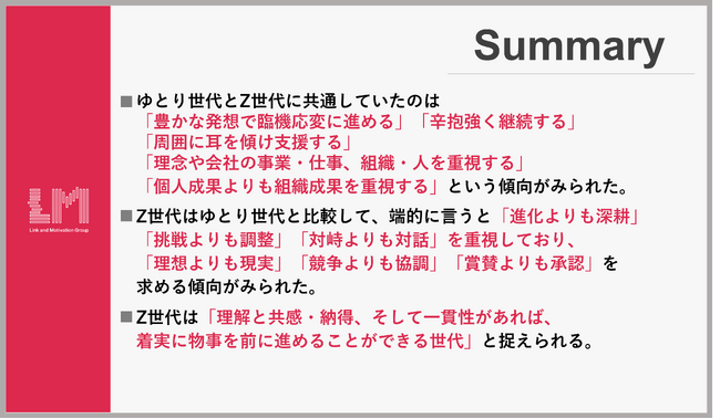 ・ゆとり世代、Z世代ともに推進力ならびに機動力や発想力、忍耐力や持続力、傾聴力や支援力が高く、理念戦略・事業内容・仕事内容・人的魅力・組織風土を重視し、ゼネラリスト指向が高い傾向であった。