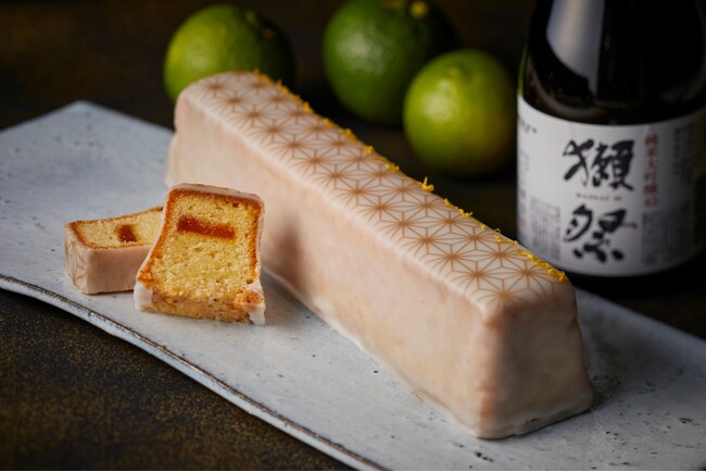 加藤パティシエの出身地・山口県の名産「獺祭 純米大吟醸45」と、県オリジナル柑橘「ゆずきち」を組み合わせた受賞作「獺祭とゆずきちが織りなす ~幸せますケーク~」。