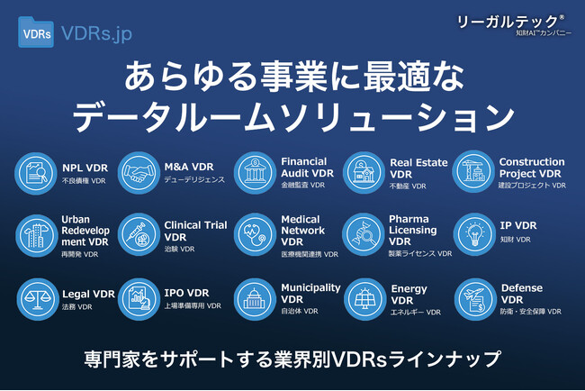 リーガルテック株式会社(本社:東京都港区、代表取締役社長:平井智之)は、機密資料の外部共有を統合管理する「VDRsポータル」を発表した。本サービスは、さまざまな業界において外部組織との協働が不可欠なプロジェクトを安全かつ効率的に推進するための新たなデータルーム基盤の提供を開始した。