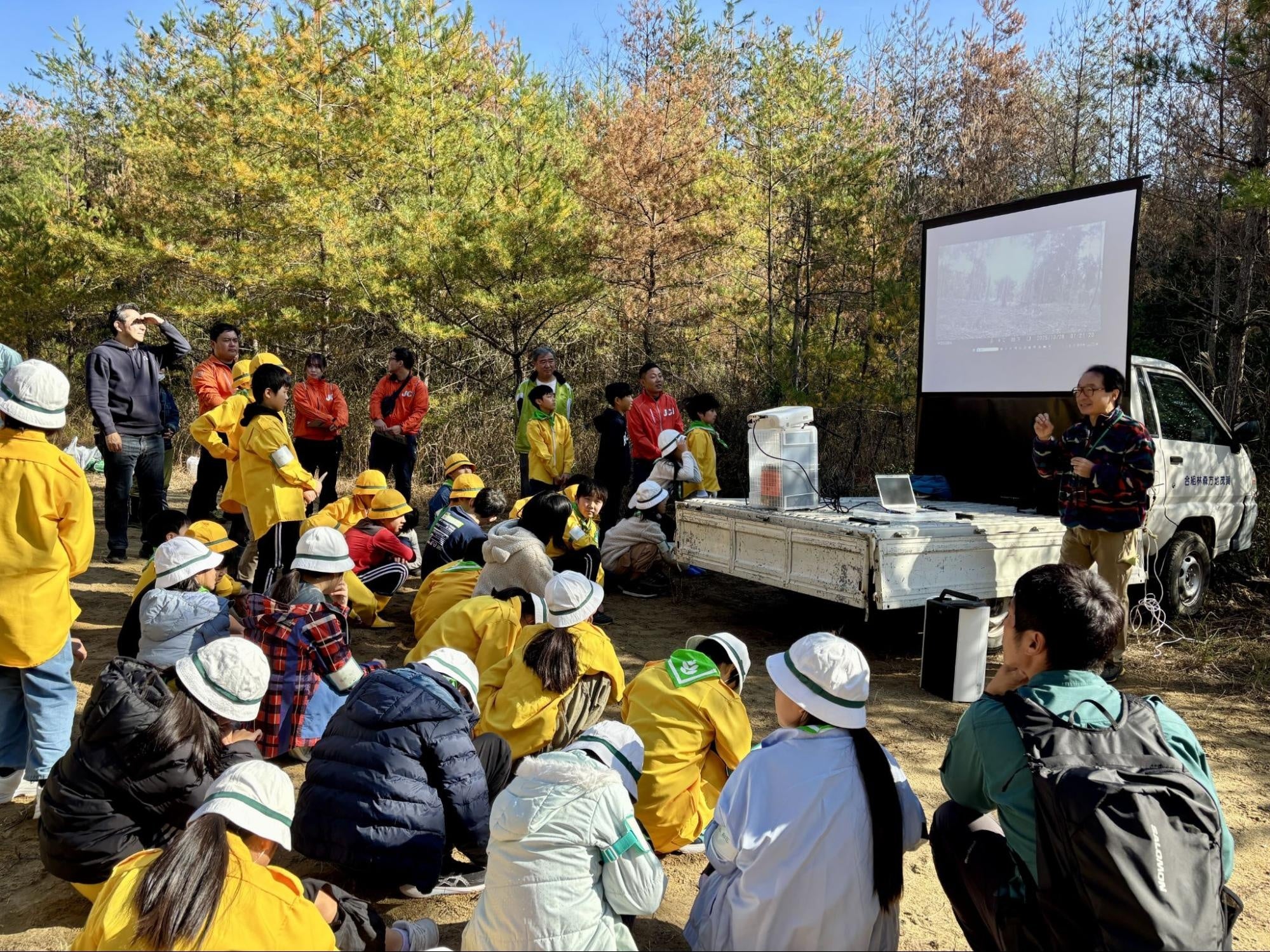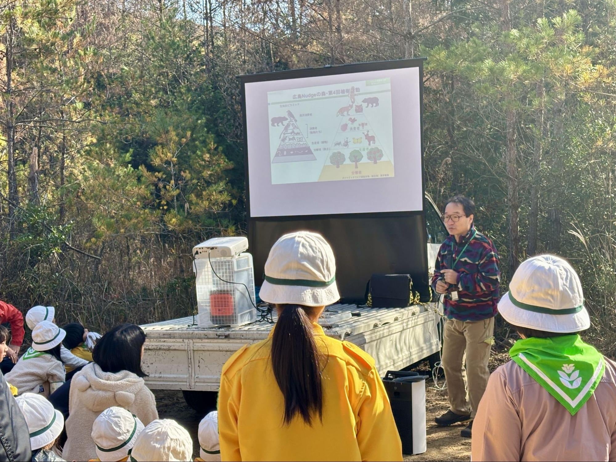 当日は広島大学・西堀教授による特別講演も行われました。本講演では、「広島Nudgeの森」の取り組みがSDGsの目標15「陸の豊かさも守ろう」に位置づけられることを紹介しながら、木を植えることはゴールではなく、土・水・微生物・昆虫・シカやイノシシ・クマなど、さまざまな生き物が関わり合うことで初めて森が豊かになるという「生態系ピラミッド」について、子どもたちにも分かりやすく語られました。