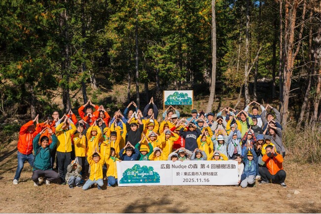 ナッジ株式会社(本社:東京都千代田区、代表取締役:沖田 貴史)は、2025年11月16日(日)、広島県東広島市 入野財産区「広島Nudgeの森」にて、第4回となる植樹活動を開催しました。本活動は、日常の買い物を通じて森林再生に貢献できるナッジカード「広島Nudgeの森」クラブを起点に、自治体・森林組合・企業・大学・市民が協働する産官学連携プロジェクトとして2022年から毎年開催しており、本年も地域が一体となって森づくりに取り組む機会となりました。