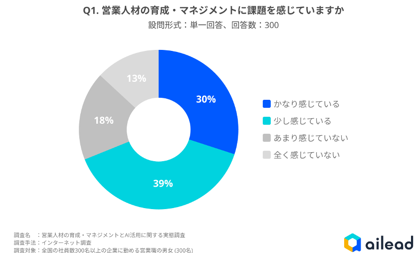株式会社ailead(本社:東京都港区、代表取締役:杉山大幹)が提供する商談・面談解析クラウド「ailead(エーアイリード)」は、全国の営業職300名を対象に「営業人材の育成・マネジメントとAI活用に関する実態調査」を実施しました。