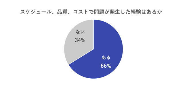 これまでのITプロジェクトにおいて、「スケジュール」「品質」「コスト」のいずれかで問題が発生した経験の有無を調査したところ、66%が「経験あり」と回答しました。DX推進や内製化の流れが強まるなかでも、依然として計画遅延やコスト超過などの課題が多くの現場で発生している実態が浮き彫りとなりました。