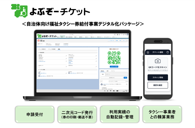 『よぶぞーチケット』は、自治体の福祉タクシー券給付事業の業務をペーパーレス化する機能を有したAppExchangeのパッケージ製品です。福祉タクシー券の「申請受付」「二次元コード発行」「利用実績の一元管理」「タクシー事業者への精算業務」をSalesforce標準機能と組み合わせて導入できます。