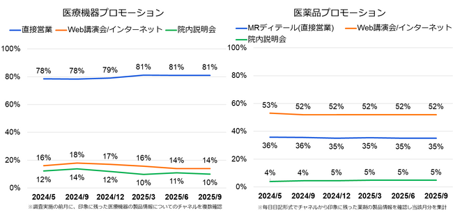 全国200床以上の施設に勤務する「循環器内科」「心臓血管外科」「消化器内科」「消化器外科」「整形外科」「脳神経外科」合計900人の医師に、「医療機器の製品情報の入手状況」を確認しました。今回の調査でも「直接営業」からの情報入手割合は81%で、過去調査と同様に最も多い情報源となりました。「Web講演会/インターネット」は14%、「院内説明会」は10%で、前年同月である2024年9月の調査と比較すると、どちらも4ポイント減少しています。また、「製薬企業のプロモーション活動」を日記形式で確認している調査Impact Track(※3)においても、今回の医療機器の調査対象セグメント(6診療科・200床以上)に合わせて算出したところ、「医療機器の製品情報の入手状況」同様、2025年6月の調査と比較して大きな変化は見られませんでした。