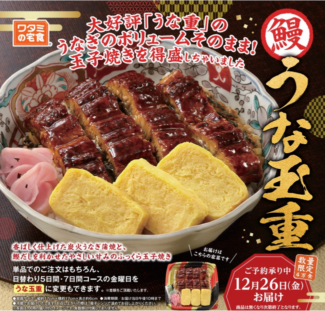 「ワタミの宅食」では季節や行事を感じていただけるよう、特別弁当の販売を数量限定・月替わりで行っております。今回販売の 「うな玉重」は2025年12月26日(金)にお届けいたします。