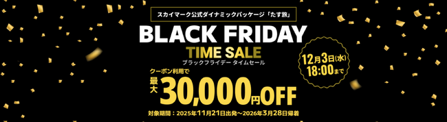 【最大30,000円OFF♪BLACK FRIDAY TIME SALE】スカイマーク公式ダイナミックパッケージ「たす旅」で最大3万円OFFクーポンを配布!年末年始・冬休みなど人気の日程は早い者勝ち!