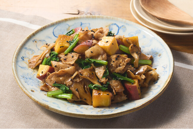 概要:醤油べースの甘辛なたれに豚肉のコクと食べごたえをプラス。さつまいもとともにほっくりと炒め、甘じょっぱい大学いも風に仕上げました。どこかほっとする懐かしい味わいで、シャキシャキの小松菜、ぷちぷちとした黒ゴマの食感も楽しみながら、最後まで飽きずに食べられる工夫も入れています。