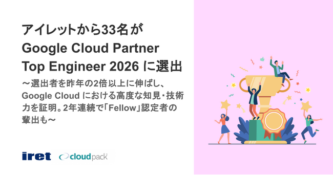 システム・アプリケーションの開発、グラフィック・UI/UX デザイン制作からインフラの構築・運用までをワンストップで提供するアイレット株式会社(本社:東京都港区、代表取締役社長:岩永 充正、以下 アイレット)は、この度 「Google Cloud Partner Top Engineer」アワードプログラムにおいて、社員33名が、Google Cloud Japan が高い技術力を持ったエンジニアを表彰するプログラムである 「Google Cloud Partner Top Engineer 2026」に選出されたことをお知らせします。 また、昨年に続き、Partner Top Engineer の中でも特に素晴らしい貢献した人物として「Google Cloud Partner Top Engineer 2026 Fellow」を西田 駿史が受賞しました。