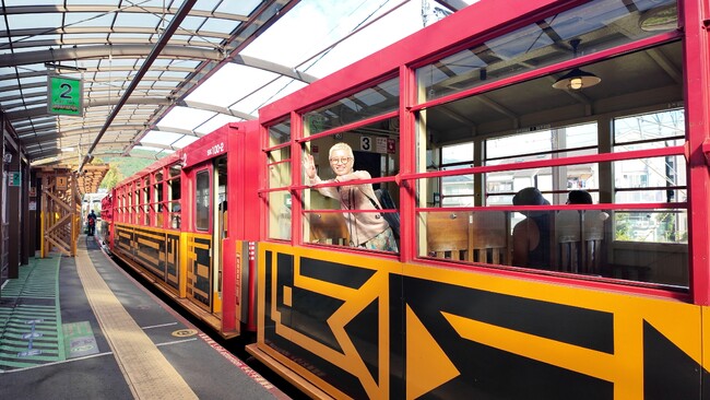 嵯峨野トロッコ列車から手を振るロシアン佐藤さん