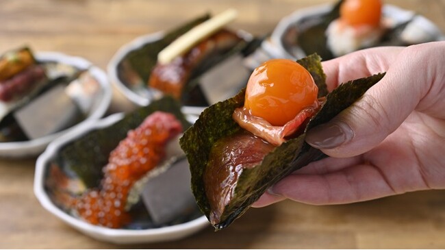 ふんわりした酢飯に、鰻・和牛・海鮮をたっぷりのせて海苔でやさしく包み込みました。片手で手軽に楽しめるのに、味わいは本格派。ヘルシーでフォトジェニックな“持ち歩ける寿司”として人気上昇中です。