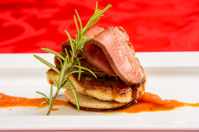 温菜には、ソテーしたフォアグラと鴨肉のロティ。完熟柿のソースとローズマリーの香りがフォアグラのコクを一層芳醇に際立たせます。