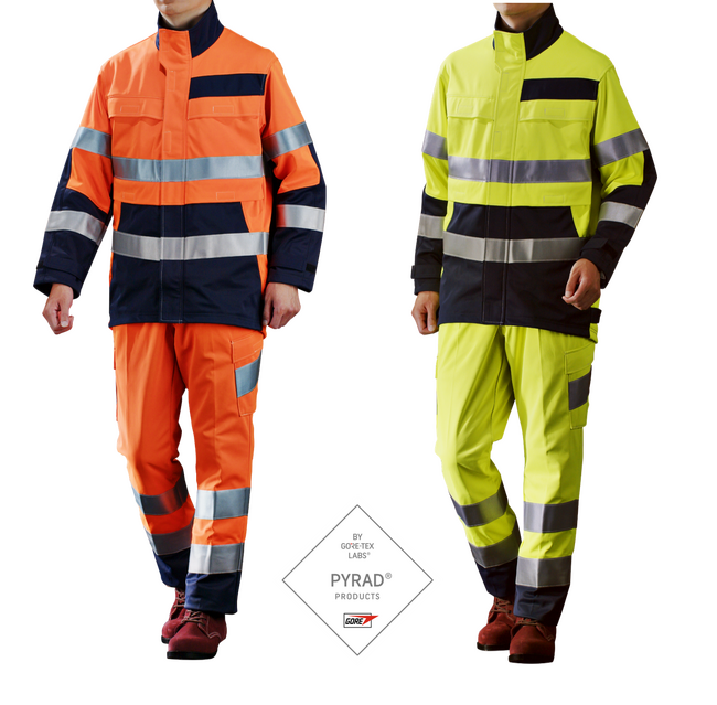 この度素材として採用した、日本ゴアの「PYRAD(R) ファブリクス by GORE-TEX LABS(R)」は、軽量性と高い防護性能を両立した革新的素材です。素材に組み込まれた難燃性能は製品寿命まで劣化することなく、 EN IEC61482-2:2020など複数の国際規格に適合しながら、驚異的な軽さと透湿性を実現しています。従来のアークフラッシュ防護服で使用されるモダクリルコットン等の多層生地構造に対し、PYRAD(R)ファブリクスの単層生地構造により大幅な軽量化を実現。さらに企業へのユニフォームを納入するにあたり、顧客からの声を生かしつつ快適性・運動性を生かした縫製技術を応用。規格に準拠した安全な防護服ながら、軽くて動きやすい機能性を両立させることに成功しました。