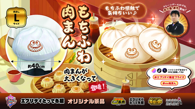 サイズは約40cmのビッグサイズで、抱きしめると“もちもち・ふわふわ”の心地よさが全身を包み込みます。さらに今回の肉まんには、エブリデイとれトレ屋 桶川店のキャラクター「トレ」の顔が刺繍された特別なデザインを採用。