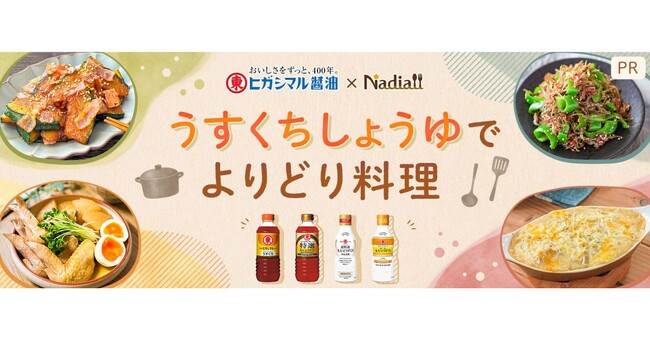 Nadia株式会社(東京都港区/代表取締役社長 葛城嘉紀 以下「Nadia」)とヒガシマル醤油株式会社(兵庫県/代表取締役社長 竹内宏平 以下「ヒガシマル醤油」)がタイアップし、特設企画ページ【うすくちしょうゆでよりどり料理】を公開いたしました。