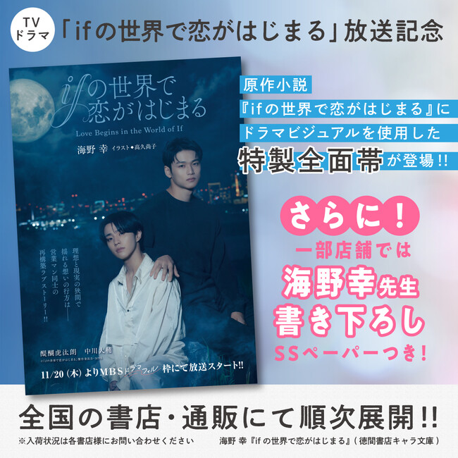 株式会社徳間書店(本社:東京都品川区上大崎 代表取締役社長:小宮英行)は、TVドラマ「ifの世界で恋がはじまる」の放送を記念して、原作となる人気BL小説『ifの世界で恋がはじまる』(海野 幸著/キャラ文庫)のドラマポスタービジュアルを使用した特製全面帯を順次全国の書店にて展開いたします。さらに一部店舗では、海野 幸先生による書き下ろしSSペーパーをプレゼントいたします。