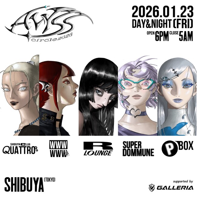 DAY & NIGHT 渋谷5会場・7フロア使用。20年代以降のジャンルやカテゴリーを超越する感覚を、AVYSSの視点で包括するサーキット・イベント。2026年1月23日(金)に開催決定。