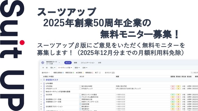 株式会社スーツ(所在地:東京都千代田区、代表取締役社長CEO:小松 裕介)は、チームでかんたん、チームのタスク管理・プロジェクト管理ツール「スーツアップ」において、2025年に創業50周年を迎えた企業の無料モニターを募集いたします。