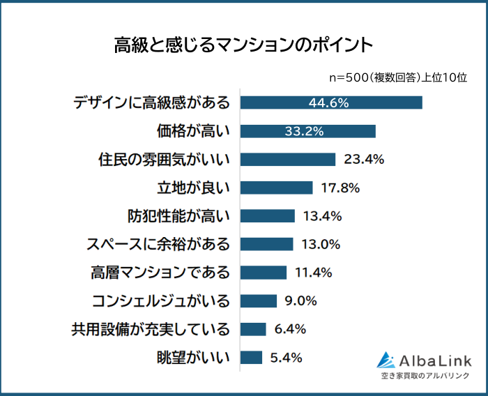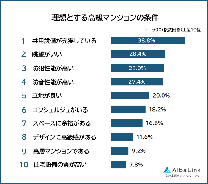 今回、株式会社AlbaLink( https://albalink.co.jp/)が運営する訳あり物件買取ナビ( https://albalink.co.jp/realestate/)は、全国の男女500人を対象に「理想とする高級マンションの条件」についてアンケート調査を実施しました。