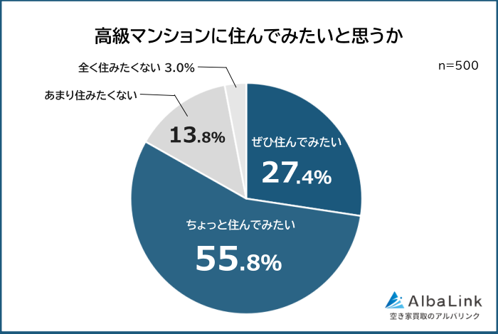 全国の男女500人に「高級マンションに住んでみたいと思うか」を聞いたところ、「ぜひ住んでみたい(27.4%)」「ちょっと住んでみたい(55.8%)」が合わせて83.2%でした。