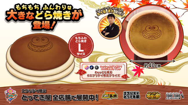 もちもち&ふんわり食感を再現した、特大サイズのどら焼きをモチーフにしたぬいぐるみが新登場となります! 直径約40cmのビッグサイズで、思わず抱きしめたくなるインパクトとボリューム感が魅力です。表面には、エブリデイとれトレ屋 桶川店のキャラクター「トレ」の顔が焼き印風に刺繍された特別なデザインを採用。