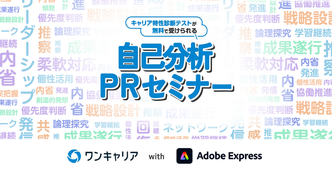 採用支援サービス「ワンキャリア」を展開する株式会社ワンキャリア(本社:東京都渋谷区、代表取締役社長 執行役員CEO:宮下 尚之、以下「ワンキャリア」)は、アドビ株式会社(以下「アドビ」)が提供するデザインツール「Adobe Express」と機能連携し、2027年卒・2028年卒の大学生/大学院生を対象にした、就活生の“自己分析”と“自己PR”の悩みを解決する「自己分析・PRセミナー」を開発し、2025年11月より公開しました。
