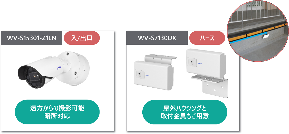 屋外ハウジング(WV-QHS500-W)と壁取付金具(WV-QWL505)を組み合わせることで、トラック下部の狭いスペースにも設置可能です。バース停車時のナンバー認識に最適です。