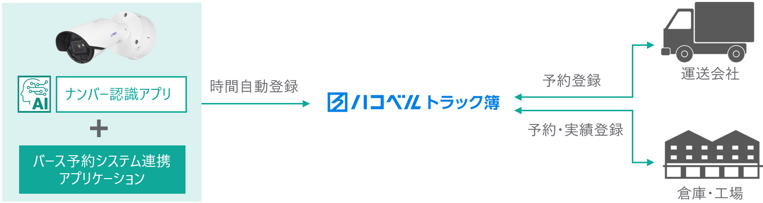 AIカメラ内でナンバー認識処理を実行し、バース予約システム連携アプリケーションと組み合わせることで、認識結果をトラック簿へ自動アップロードします。