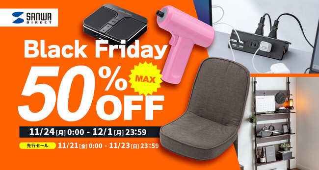 サンワサプライ株式会社(本社:岡山市北区田町1-10-1、 代表取締役社長 山田 和範)が運営するサンワダイレクト Amazon店は、Amazonで11月21日(金)0時から11月23日(日)23時59分まで開催される「ブラックフライデー 先行セール」及び、11月24日(月・休)0時から12月1日(月)23時59分まで開催される「Amazon ブラックフライデー」において1636商品が最大50%OFFになるタイムセールを開催いたします。