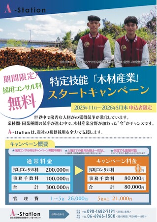 株式会社A-station(本社:大阪市中央区、代表取締役:奥村真弘)は、木材産業の人手不足に対応するため、「特定技能・木材産業 採用コンサル料0円キャンペーン」 を 2025年11月1日~2026年5月31日 の期間に申込した事業所 限定で実施します。