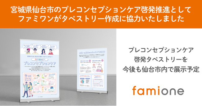 「子どもを願うすべての人によりそい 幸せな人生を歩める社会をつくる」をビジョンに掲げ、法人の従業員向け福利厚生や自治体の住民向け支援を行うヘルスケアサポートサービス「ファミワン」 https://famione.com/benefit/などを展開する株式会社ファミワン(本社:東京都渋谷区、代表取締役:石川 勇介)は、宮城県仙台市(市長:郡 和子、以下仙台市)の要請を受け、プレコンセプションケアの啓発資料として、タペストリーを作成協力いたしました。