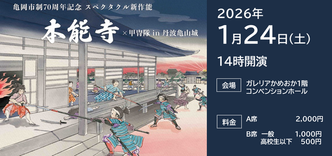 京都府亀岡市(市長:桂川孝裕)ら市内観光事業者等でつくる、亀岡光秀まつり実行委員会(実行委員長:奥村昌信)は、亀岡市制70周年記念事業とし、亀岡市の文化・芸術を発信するため、スペクタクル新作能『本能寺』を制作、令和8年1月24日(土)にガレリアかめおかで上演します。