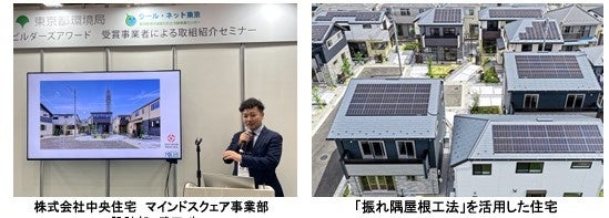 11月19日に東京ビッグサイト(東京国際展示場)で開催された「ジャパンホームショー&ビルディングショー」(主催:一般社団法人日本能率協会)内の東京都環境局・東京都環境公社ブースにて、株式会社中央住宅が、「令和6年度東京エコビルダーズアワード」を受賞した事業者としてセミナーに登壇しました。セミナーでは、建築物環境報告書制度の達成状況や、脱炭素に向けた取り組み事例である「東京ゼロエミ住宅」の分譲地の開発、斜線制限が厳しい条件下における太陽光パネル敷設に適した屋根工法「振れ隅屋根工 法」のプレカット化の実現(2025年度グッドデザイン賞受賞)等について紹介しました。