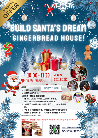 Global Learner’s Institute(GLI)晴海校では、12月14日(日)にクリスマス特別イベント『Build Santa’s Dream Gingerbread House!』を開催いたします。