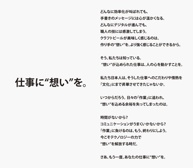 そうして生まれた「時間」や「心の余白」は、必ずや、その人本来のクリエイティビティや、仕事への情熱を呼び戻すことができると信じているからです。