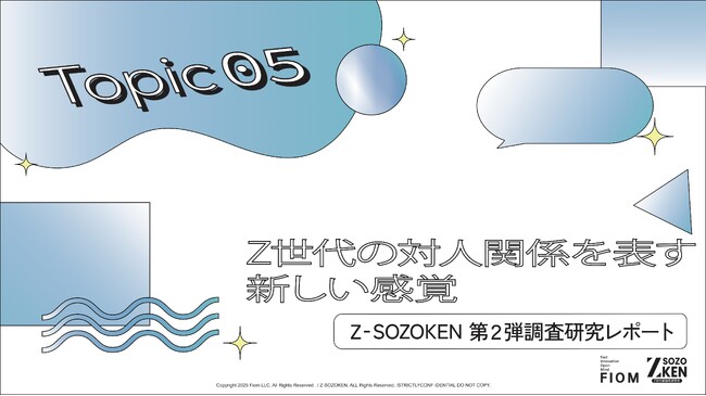 Z世代に特化したクリエイティブカンパニーFiom合同会社(本社:東京都渋谷区、代表社員:竹下洋平)が運営しているZ世代の実態や価値観を分析するシンクタンク、Z-SOZOKEN(Z世代創造性研究所)は、Z-SOZOKEN THINKTANK 最新調査研究レポートの第二弾として『Z世代の気まずいの感覚』についての調査研究レポートの第5章インサイトサマリー「Z世代の対人関係を表す新しい感覚」をリリースしました。