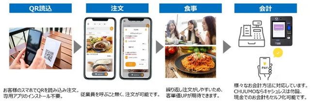 [画像2: https://prcdn.freetls.fastly.net/release_image/107911/30/107911-30-430472c02e3cbbdedf3ab78cdeaad373-804x270.png?width=536&quality=85%2C75&format=jpeg&auto=webp&fit=bounds&bg-color=fff ]「CHUUMO」は、アプリのダウンロードやユーザー登録が不要で、QRコードをスマホで読み取り、来店客がセルフで飲食店での注文から会計までを済ませることが可能なサービスです。受注業務、会計業務をセルフ化することで、飲食店様における人手不足の解消に寄与します。来店客のスマートフォンでのキャッシュレス決済に対応の他、インバウンドにも対応しております。また、マミヤ・オーピーグループの経営基盤を活かした手厚いサポート体制が整っており、全国に保守拠点、365日対応可能な自社コールセンターを構えております。