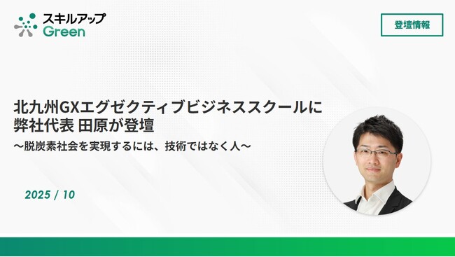 株式会社スキルアップNeXt(東京都千代田区、代表取締役 田原 眞一、以下「スキルアップNeXt」)の代表 田原が、公益財団法人 地球環境戦略研究機関(神奈川県三浦郡、理事長 武内 和彦、以下「地球環境戦略研究機関」)が主催する「北九州GXエグゼクティブビジネススクール」の講義に登壇し、GX(グリーン・トランスフォーメーション)人材育成の重要性について解説いたしました。