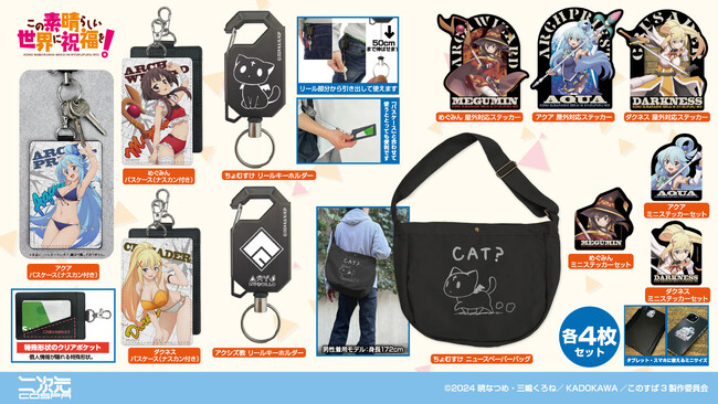 二次元コスパより、アニメ『この素晴らしい世界に祝福を!』のアクアやめぐみん、ダクネスたちの「パスケース」をはじめ、「ちょむすけ ニュースペーパーバッグ」など新グッズが登場です。