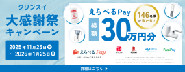 期間中に通常販売商品、定期配送商品、レンタル商品をご購入またはお申し込みいただいたお客様と、定期配送・レンタル浄水器をご継続されている会員様を対象に、抽選で合計146名様に「えらべるPay」総額30万円分をプレゼントいたします。
