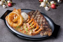 280gのサーロインステーキとグリルドシュリンプを、ケイジャンスパイスをきかせたスパイシーなルイジアナ州ニューオリンズ風ソースで。