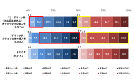 「ドリンク剤」と「ミニドリンク剤(指定医薬部外品)」のカテゴリの購入者について、性年代比率を見ていきます。「ドリンク剤」は男女ともに40代以上の割合が高く、「ドリンク剤」に比べて「ミニドリンク剤(指定医薬部外品)」は男女ともに20~30代の購入が活発でした。【図表7】 「ミニドリンク剤(指定医薬部外品)」は、平均単価が前年から5.1%減少し【図表6】、1人あたりの購入金額は上昇していることから(※6)、低価格の商品を数多く(頻度高く)購入している様子がうかがえます。