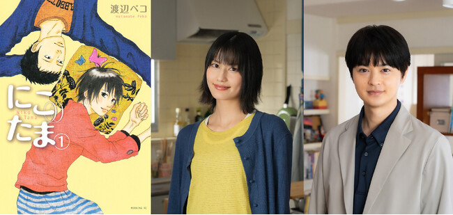 (左)漫画『にこたま』書影 (C)渡辺ペコ/講談社 ドラマ『にこたま』 (中)浅尾温子役・橋本愛、(右)岩城晃平役・瀬戸康史 (C)渡辺ペコ/講談社/フジテレビ