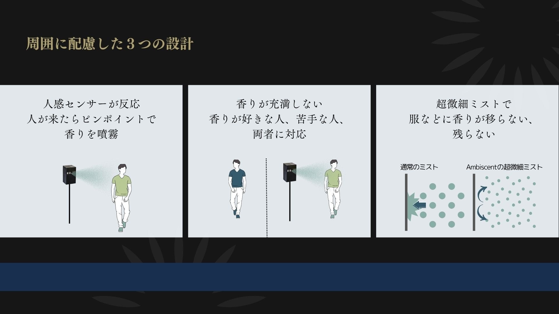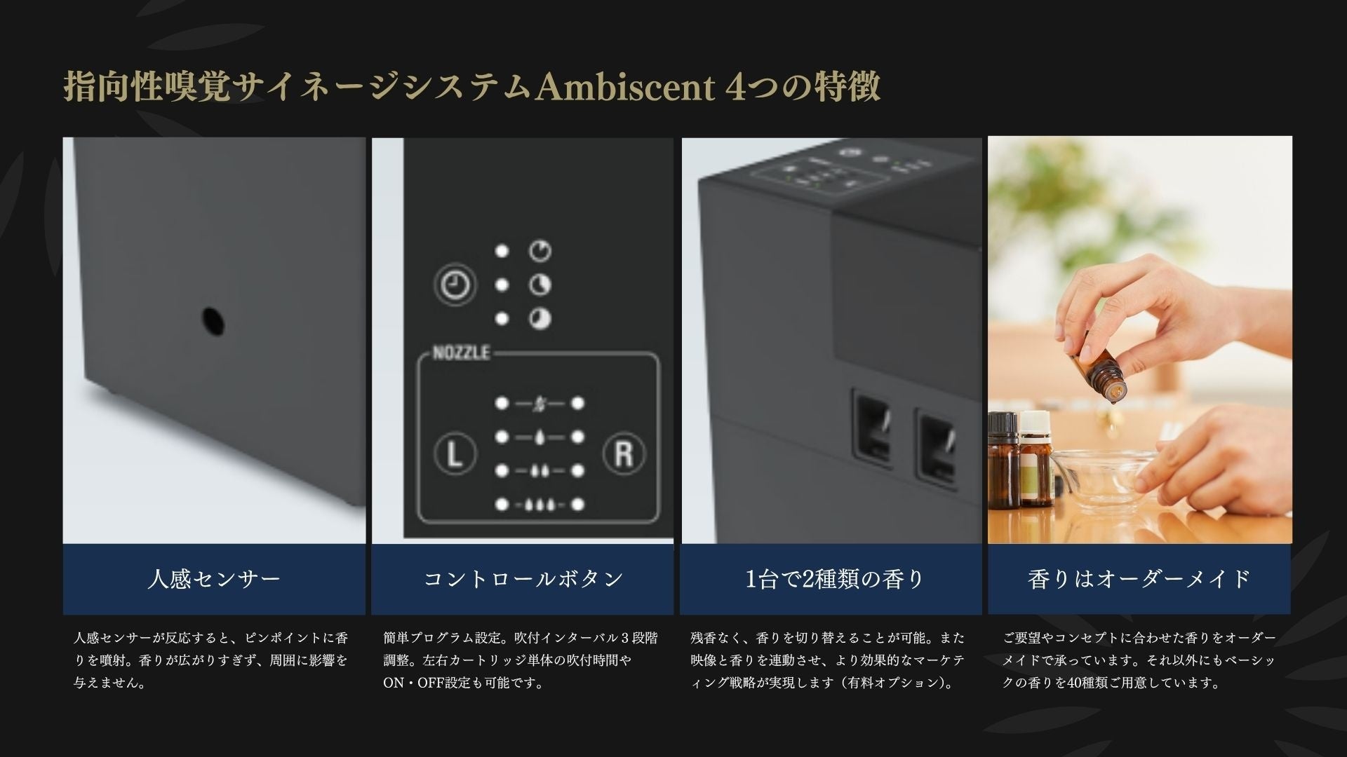 SceneryScent独自開発の専用ディフューザー「指向性嗅覚サイネージシステム『Ambiscent(アンビセント)』」を用い、同一空間に“香る/香らない”のコントラストをつくることで、受付で気持ちが切り替わり、その後の滞在は無臭域で集中しやすい体験を実現しています。