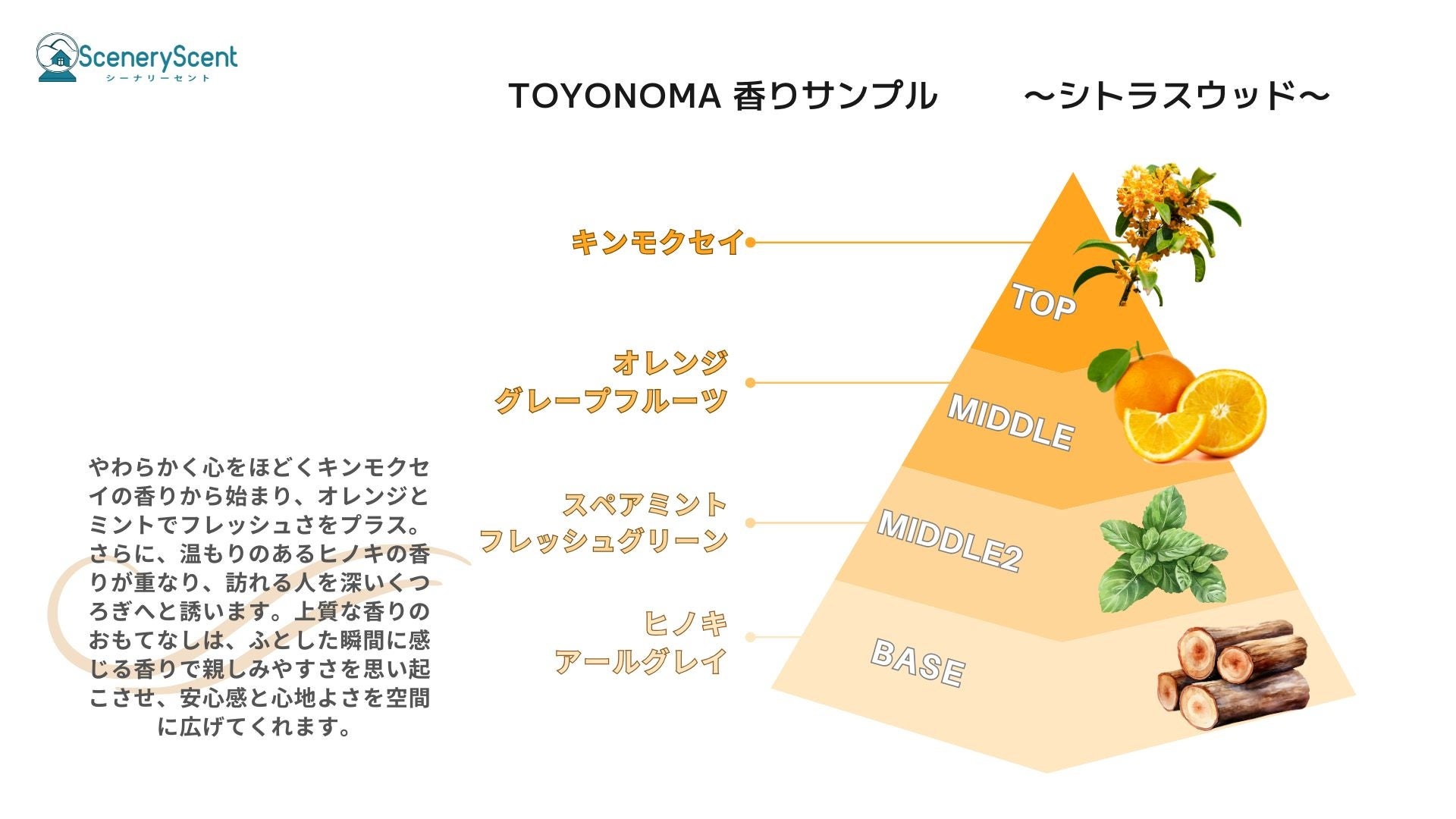 香りは〈シトラスウッド〉。トップはやわらかな印象のキンモクセイ、ミドルにオレンジやグレープフルーツの明るさ、続いてスペアミントとフレッシュグリーンの爽やかさ、ラストはヒノキ(ウッディ)とアールグレイの落ち着いた安定感で余韻を設計。