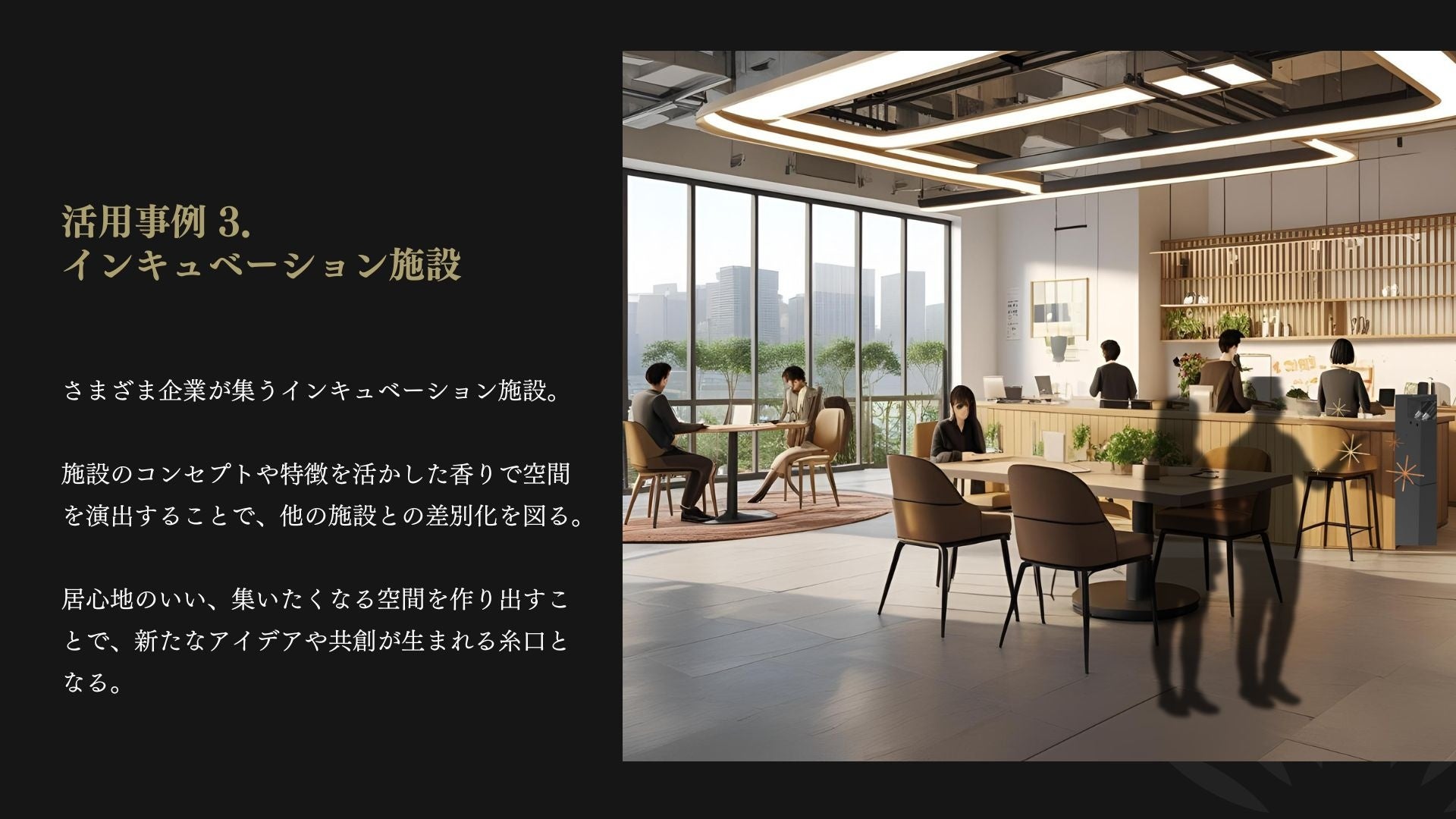 本プロジェクトは、三菱地所株式会社、株式会社IHI、コクヨアンドパートナーズ株式会社と協働し、施設の狙い・利用者像・動線をヒアリングして香りの役割を設計したものです。