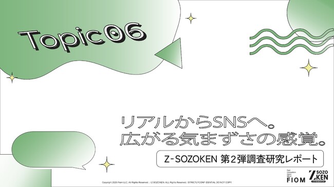 Z世代に特化したクリエイティブカンパニーFiom合同会社(本社:東京都渋谷区、代表社員:竹下洋平)が運営しているZ世代の実態や価値観を分析するシンクタンク、Z-SOZOKEN(Z世代創造性研究所)は、Z-SOZOKEN THINKTANK 最新調査研究レポートの第二弾として『Z世代の気まずいの感覚』についての調査研究レポートの第6章インサイトサマリー「リアルからSNSへ。広がる気まずさの感覚。」をリリースしました。
