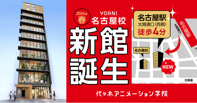株式会社代々木アニメーション学院(本社:東京都千代田区 代表取締役社長:橋本 大輝)は、近年の学生増加を背景に、より充実した学習環境へのニーズに応えるため、2026年春に名古屋市・名駅エリアに新校舎「代々木アニメーション学院 名古屋校 新館」を新設することをお知らせします。