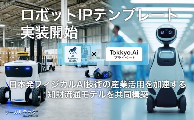 リーガルテック株式会社(東京都港区:代表取締役 平井 智之)およびAIデータ株式会社(東京都港区:代表取締役 佐々木 隆仁)は、日本発のフィジカルAI技術を対象とした共同発表として、AI知財プラットフォーム「Tokkyo.Ai」とロボット知能基盤「AI Robotics on IDX」を活用した「ロボットIPテンプレート」を実装した。