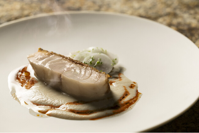 スケトウダラの白子を使用したかまぼこ「たちかま」から着想を得た一皿です。たちかまは、旨味を凝縮させたソースへと仕立て、旬の焼き魚と合わせます。付け合わせには、香ばしい焼きリゾットと、さっぱりとした蕪のサラダを添えます。白子の風味豊かな濃厚なソースは、淡白な旬の白身魚と米の旨みが詰まった焼きリゾットのどちらとも相性が抜群です。